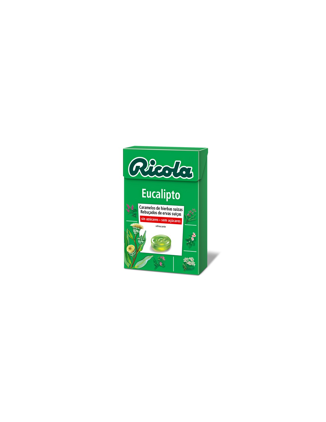Isomaltosa, sorbitol, aroma natural de menta, extracto (0,2%) de eucalipto y de la mezcla de hierbas Ricola, aroma natural de eucalipto, edulcorantes (aspartamo, acesulfamo K), mentol, colorante (clorofilas).
