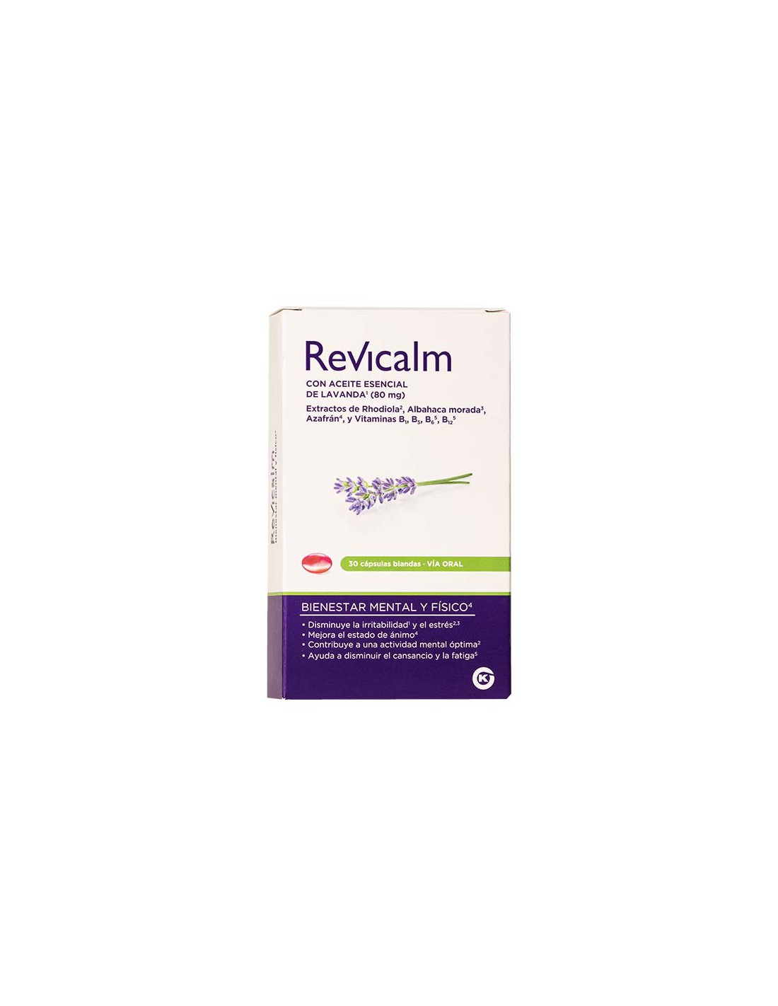 Complemento alimenticio a base de extracto raíz de Rhodiola, extracto hoja de Albahaca morada, aceite esencial de flores de Lavanda, extracto de estigmas de Azafrán, vitamina B5, vitamina B1, vitamina B12, vitamina B6 que contribuye a bienestar mental y físico, disminuye la irritabilidad y estrés, mejora el estado de ánimo.