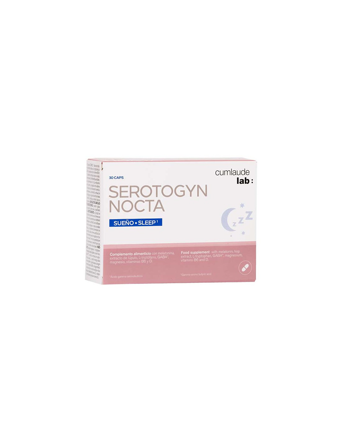 Complemento alimenticio con melatonina, extracto de lúpulo, L-tritptófano, GABA, magnesio, vitamina B6 y D.